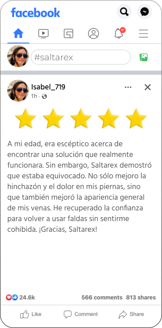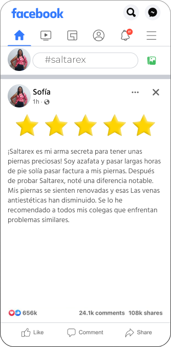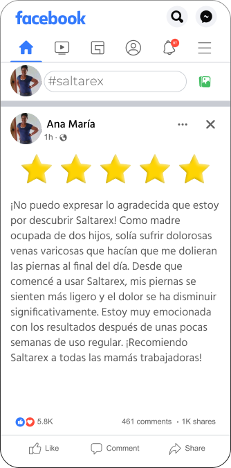 Recomiendo de todo corazón Saltarex como una solución eficaz para las venas varicosas. En mi práctica, he sido testigo de que más del 90 % de los pacientes experimentaron una disminución de la hinchazón y el malestar a las pocas semanas de usar Saltarex. Su combinación única de ingredientes naturales, incluido el extracto de té verde, el extracto de hoja de vid roja y el extracto de castaño, ha mejorado constantemente la microcirculación y ha fortalecido las paredes vasculares, contribuyendo tanto al alivio de los síntomas como a la disminución de la progresión de las venas varicosas. Como especialista con más de dos décadas de experiencia, considero que Saltarex cambia las reglas del juego, ya que proporciona resultados notables y no invasivos que mejoran la calidad de vida de los pacientes y les devuelven la confianza y la comodidad.